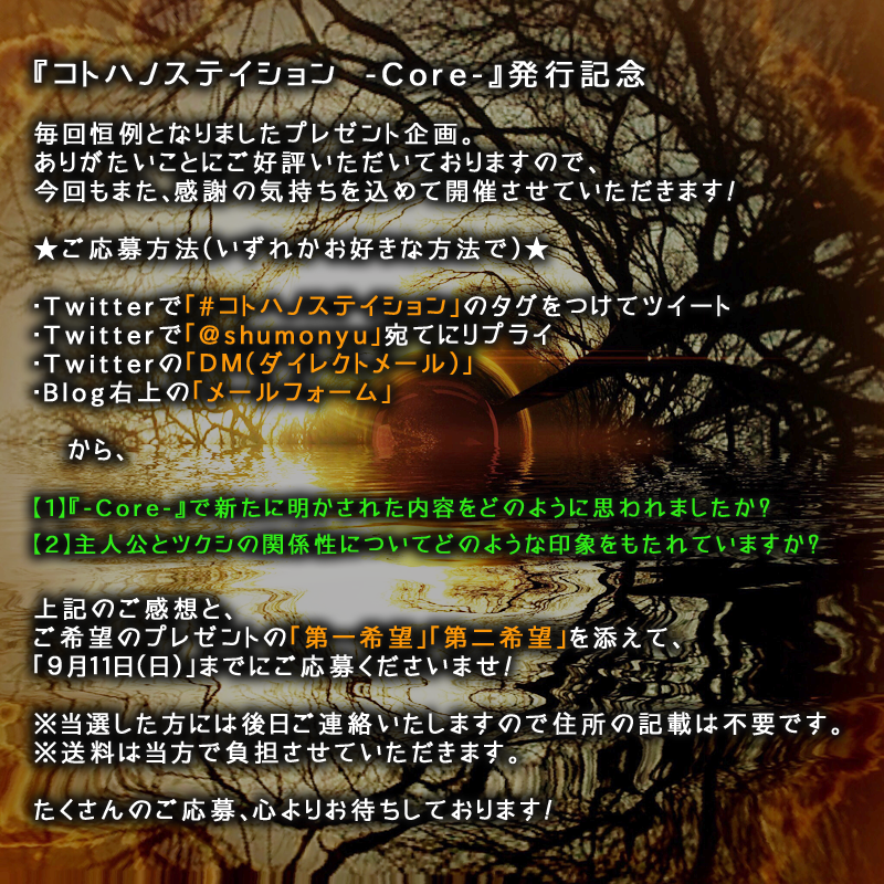http://syumon.blog.shinobi.jp/%E5%90%8C%E4%BA%BA/%E3%80%8E%E3%82%B3%E3%83%88%E3%83%8F%E3%83%8E%E3%82%B9%E3%83%86%E3%82%A4%E3%82%B7%E3%83%A7%E3%83%B3%20-core-%E3%80%8F%E9%80%9A%E8%B2%A9%E9%96%8B%E5%A7%8B%EF%BC%86%E3%83%97%E3%83%AC%E3%82%BC%E3%83%B3%E3%83%88%E4%BC%81%E7%94%BB『コトハノステイション -Core-』通販開始&プレゼント企画